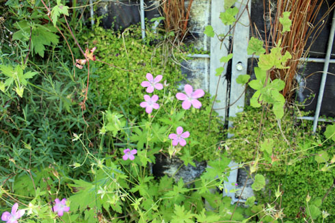 Ce sont des géraniums vivaces, un peu acrobates, moins couvrants que sur la terre ferme, mais en compagnie d’une mousse ça passe plutôt bien. A tester…