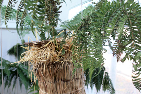 Dans la serre, une fougère arborescente a été ficelée dans de la paille: