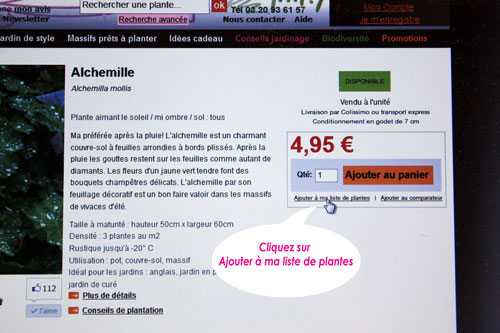 La solution? Place des Jardins me permet de gérer une liste des plantes que j’aimerais dans mon jardin, au fur et à mesure de mes visites j’en rajoute une par ci par là… il a juste suffi que j’ouvre un compte au départ.