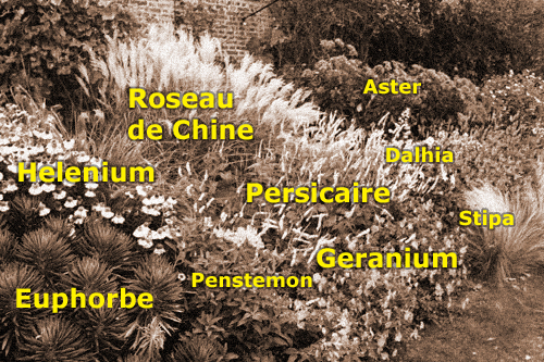 Ce qui donne ce côté jardin exotique chaleureux c’est avant tout le choix des couleurs orange des heleniums et rouge des penstémons que tempèrent les roses et les bleus, et puis le feuillage structuré des euphorbes auquel répondent les panaches des roseaux de Chine (eulalies) et plus bas des stipas.