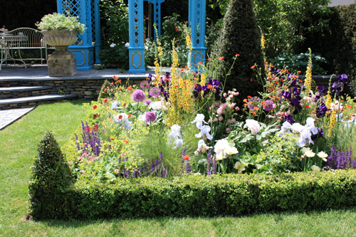 Un parterre à la fois classique et moderne par le choix des plantes vivaces: regardez comment les épis jaunes des molènes ‘Cotswold Queen’ répondent graphiquement aux pyramides en if et contrastent avec la couleur turquoise de la volière. Ce massif très coloré joue sur les contrastes de bleu et jaune, animé par des benoites oranges, et adoucis par le rose des pivoines ‘Sarah Bernhardt’.