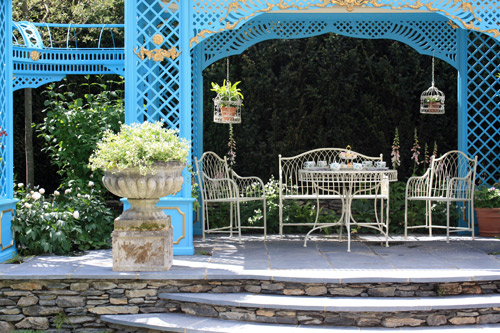 L’intérieur de la volière est aménagé en terrasse pour boire le thé. Des mini cages à oiseaux installées en clin d’oeil servent de paniers suspendus. Noter les meubles en fer forgé blanc et la peinture couleur bleu turquoise rehaussé d’or, so british!