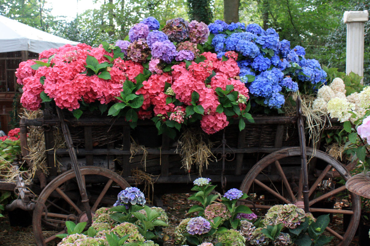 Leurs couleurs varient en fonction de la nature du sol, sauf pour les coloris blancs qui sont neutres. Si le sol est acide, les fleurs auront tendance à bleuir. Si le sol est neutre ou alcalin (par exemple calcaire) les fleurs auront tendance à rosir. On peut influer sur les couleurs des fleurs en utilisant des produits particuliers, la cendre a tendance à rendre les fleurs bleues violettes ou roses. Pour obtenir des fleurs bleues on peut incorporer de l’ardoise pilée au sol de façon régulière.
