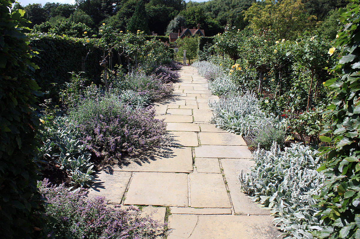 Une autre roseraie est installée à côté du potager, des vivaces à feuillage argenté aromatique font une bordure très agréable: stachys, nepetas et lavandes.