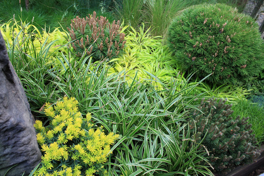 Dans les verts jaunes je cite l’épicea nain et l‘hakonechloa, une herbe du japon qui une fois installée forme un joli coussin arrondi.