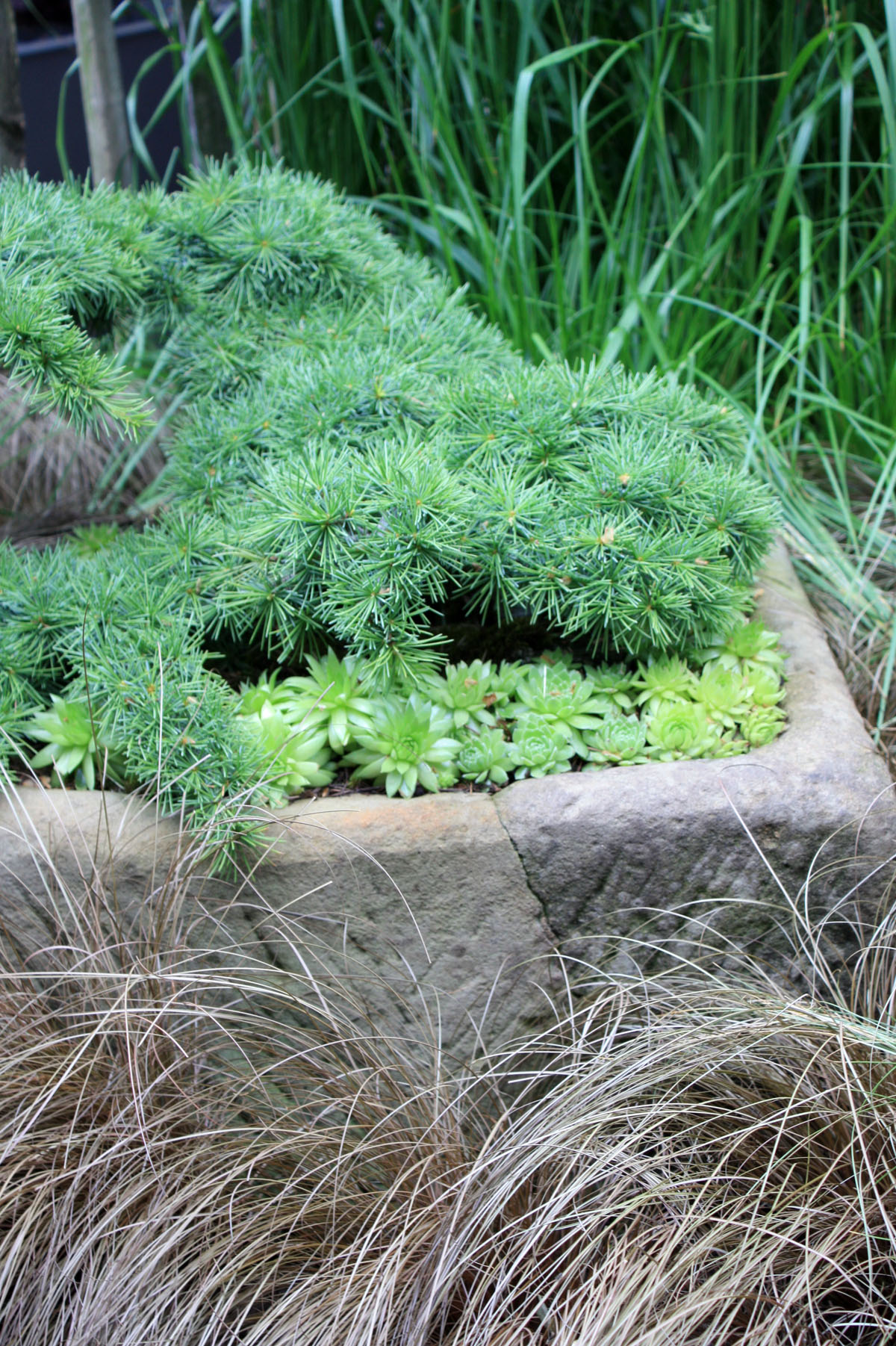 Un peu limite, le designer a ajouté un jeune cèdre du Liban dans une auge bordée de joubarbes, en bas un carex comans