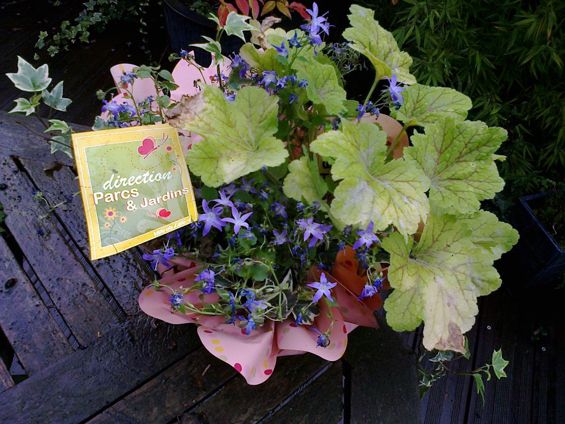 Voici la récompense pour le prix d’honneur des Balcons Fleuris! Panier garni d’heuchère, lierre et campanules des murailles