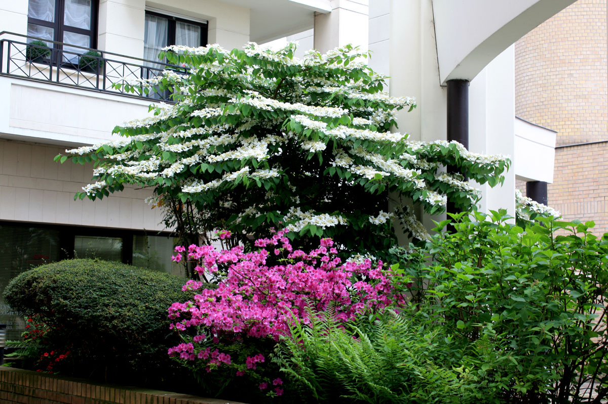 La floraison de la viorne souligne son port en étages, si l’ensoleillement est suffisant cet arbuste prend de jolies couleurs en automne avant de perdre ses feuilles. En été la floraison de l’hortensia prend la suite de l’azalée et de la viorne, un hortensia boule aura plus de présence, ou aussi un hortensia arborescent.