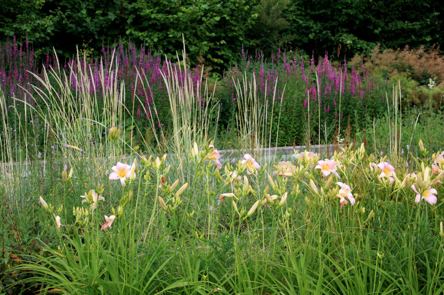 Derrière lui un massif de salicaires patauge joyeusement. Ses fleurs mauves se voient en transparence derrière les calamagrostis dorés, formant un joli contraste coloré. Cette plante se ressème facilement, on lui a réservé une bande assez large pour s’épanouir, la plante sur la droite est peut être une barbe de bouc ou une reine des près.