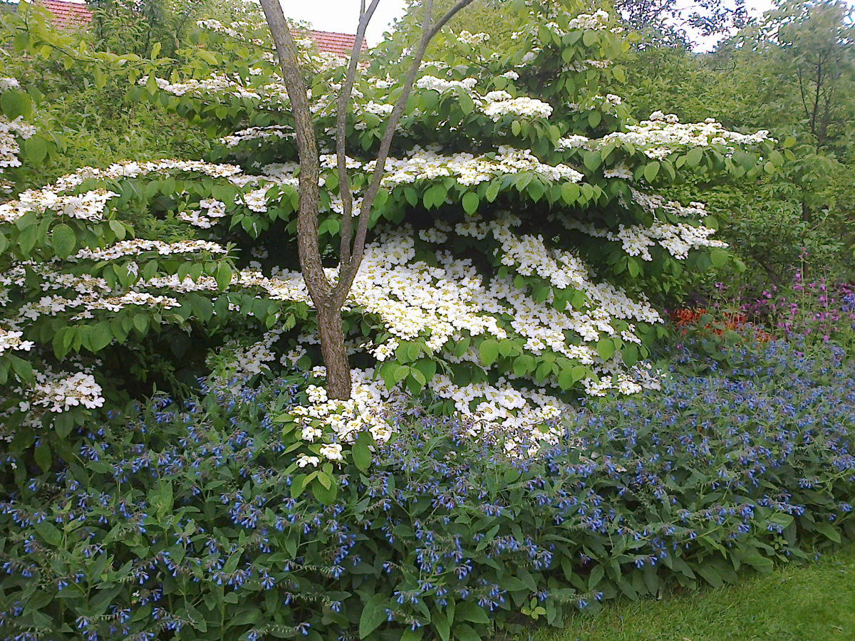 Une viorne de Chine en fleur et son tapis bleu consoude!