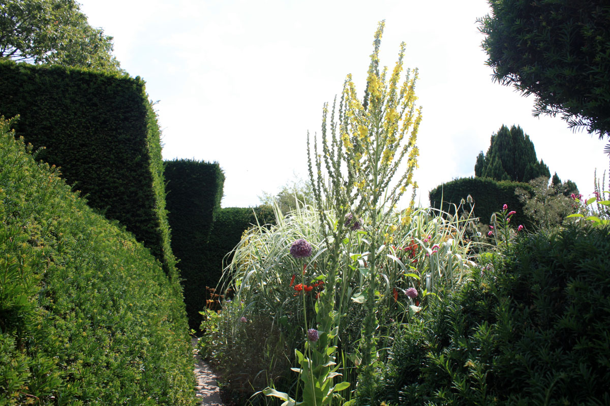 Les photos ont été prises à Great Dixter, le jardin de Christopher Lloyd, dans le Kent en Grande Bretagne. Ce grand jardinier avait comme habitude d’inviter les plantes « vagabondes » à se ressemer dans ces massifs, d’où ce côté un peu sauvage qui, combiné avec une structure de topiaires taillés régulièrement, fait tout son charme!