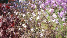 Voilà une vague d’heuchères pourpres associées à une brassée de giroflées ‘Bowles Mauve’ et des géraniums à feuillage brun comme ‘Expresso’…avec un petit arrière plan de fleurs des champs jaunes pour réhausser le tout, des boutons d’or certainement, c’est romantique!